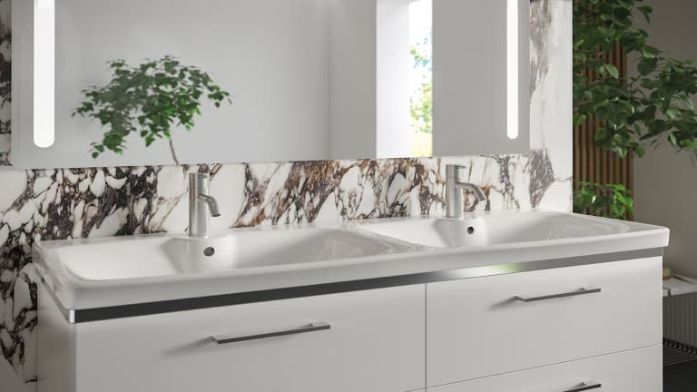 Joskus kylpyhuoneen tulisi palvella useampaa kuin yhtä henkilöä samaan aikaan. Tätä varten Glow tarjoaa pesualtaan, jossa on kaksi erillistä hanaa ja allasta yhdistettynä yhdeksi tuotteeksi, joka luo tyylikkään yhdistelmän alakaapin kanssa.